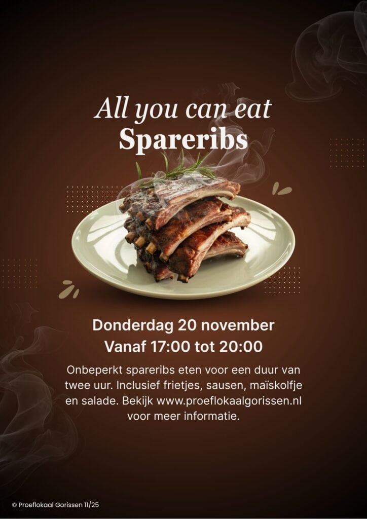 Op donderdag 20 november kun je bij Proeflokaal Gorissen genieten van een overheerlijke All You Can Eat Spareribs-avond!